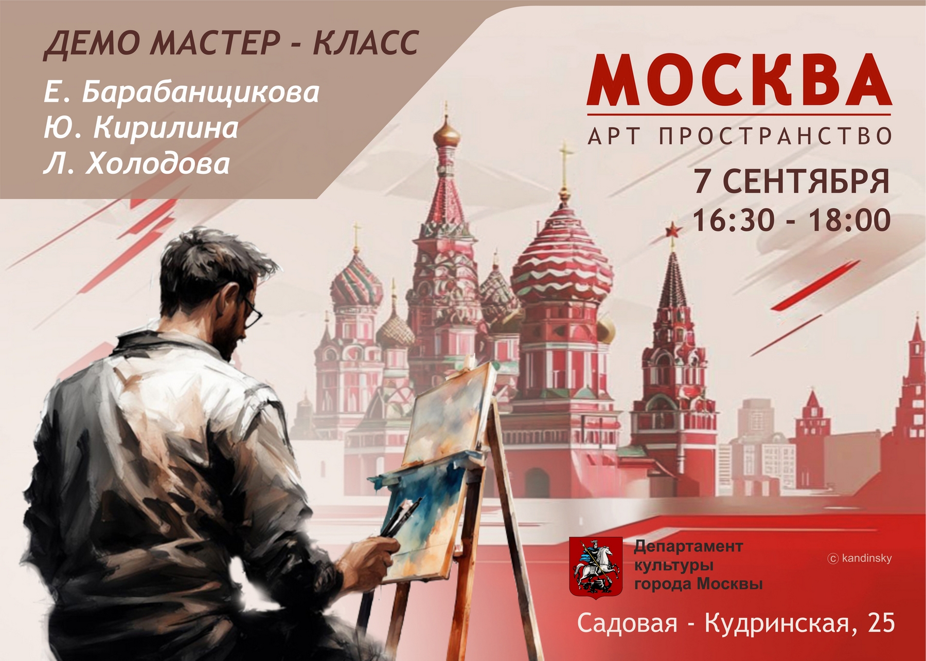 Увидеть в живую работу трёх московских художников не только большая удача, но и самое красочное впечатление праздника в честь дня рождения Москвы. И всё это волшебство будет происходить на фоне живописных полотен выставки «Арт пространство Москва».